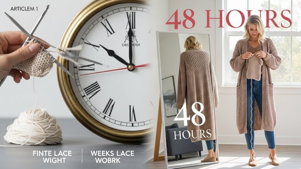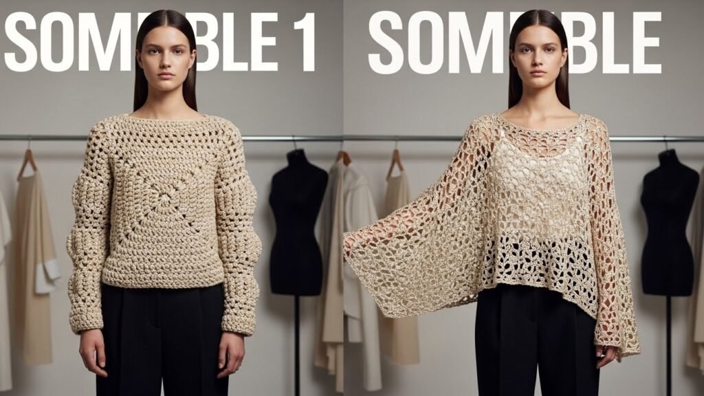 🔴 IMAGE 1 (Cover Image): A minimalist, elegant crochet garment draped over a neutral-toned chair, with sharp stitch definition and