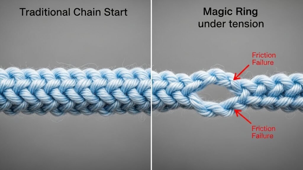 The Magic Ring relies entirely on friction to stay closed. Unlike a traditional foundation chain where the stitches are anchored into a physical loop, the Magic Ring is a “floating” structure. If the yarn is slippery—like silk, bamboo, or even mercerized cotton—there is nothing stopping that tail from eventually sliding back through the loops. Every time you wash the blanket, every time someone sits on it, every time the fibers expand and contract with the humidity, the knot moves a fraction of a millimeter. It is a slow-motion unraveling that you cannot stop once it begins. Why are we sacrificing the next fifty years for five seconds of convenience at the start of a project?
