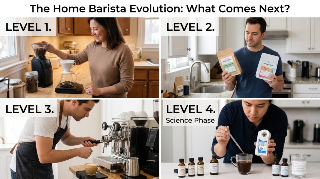 Level 4: The Science Phase. You start measuring the TDS (Total Dissolved Solids) of your coffee and experimenting with custom water recipes.